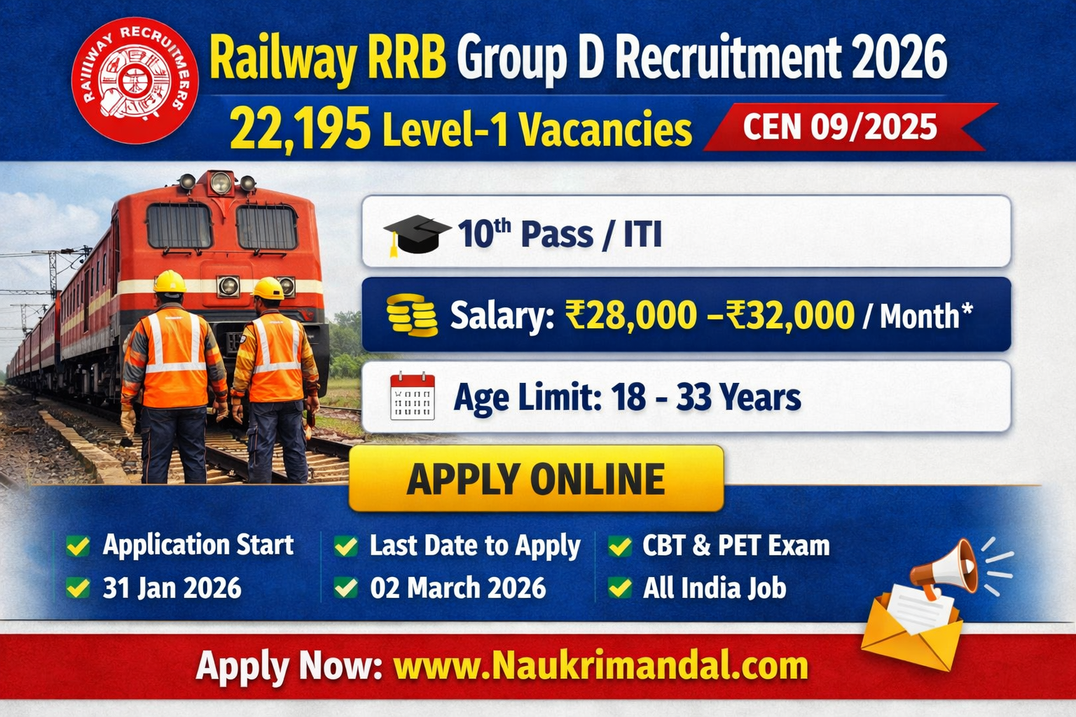 The Railway Recruitment Boards (RRB) have officially announced a massive recruitment drive for 2026. This notification is released under Advt. No. CEN 09/2025 for various Group-D (Level-1) positions across different railway zones in India. A total of 22,195 vacancies are available for eligible candidates who have completed their 10th standard or ITI. Detailed information regarding the Naukrimandal Railway Group D Online Form, eligibility criteria, and selection process is provided below.